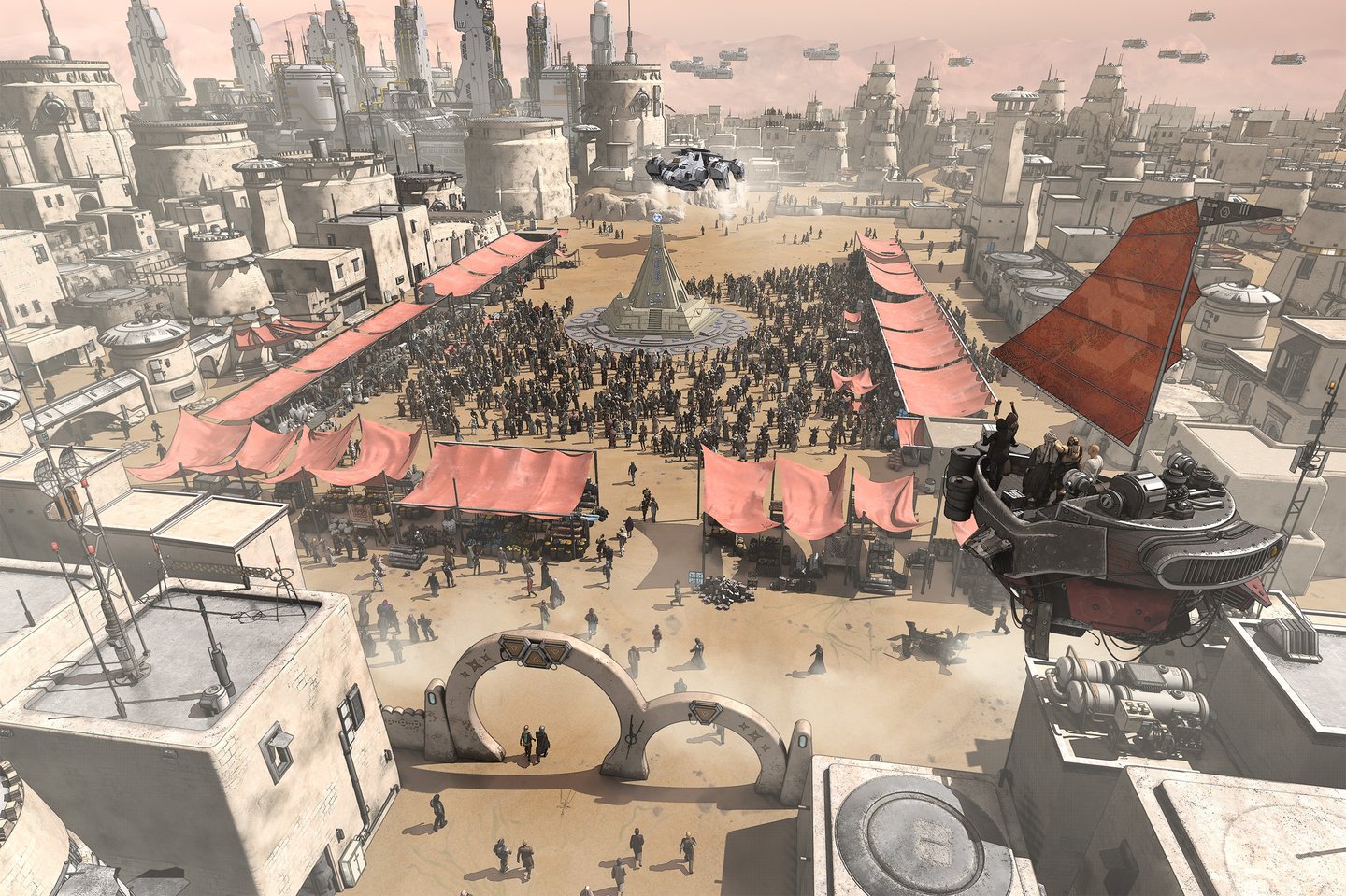 Alors que Gharib et Souuhl s’approchaient de la première rangée d’étals, un planeur fendit l’air devant eux, les obligeant à zigzaguer parmi une foule dense et oppressante. L’atmosphère était suffocante, saturée par une brume de poussière soulevée par des milliers de pas nerveux. Les étals débordaient de marchandises aux allures douteuses : pièces mécaniques rafistolées, nourriture recyclée ou mutée, et légumes aux teintes bleuâtres improbables, sans doute produits sur des sols modifiés par génie génétique.