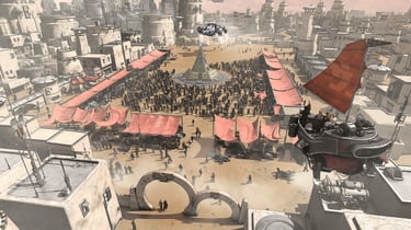 Autour du marché, les bâtiments se dressaient tels des sentinelles oubliées d’un âge révolu. Certains, cylindriques et imposants, rappelaient les forteresses des premières heures de l’Empire. Leurs toits plats croulaient sous le poids des antennes rouillées et des câbles pendants, vestiges d’un monde refusant obstinément de s’écrouler. Au-dessus, des drones et des barges flottantes patrouillaient mollement, projetant leurs ombres agitées sur la foule en contrebas, telles des esprits tourmentés.